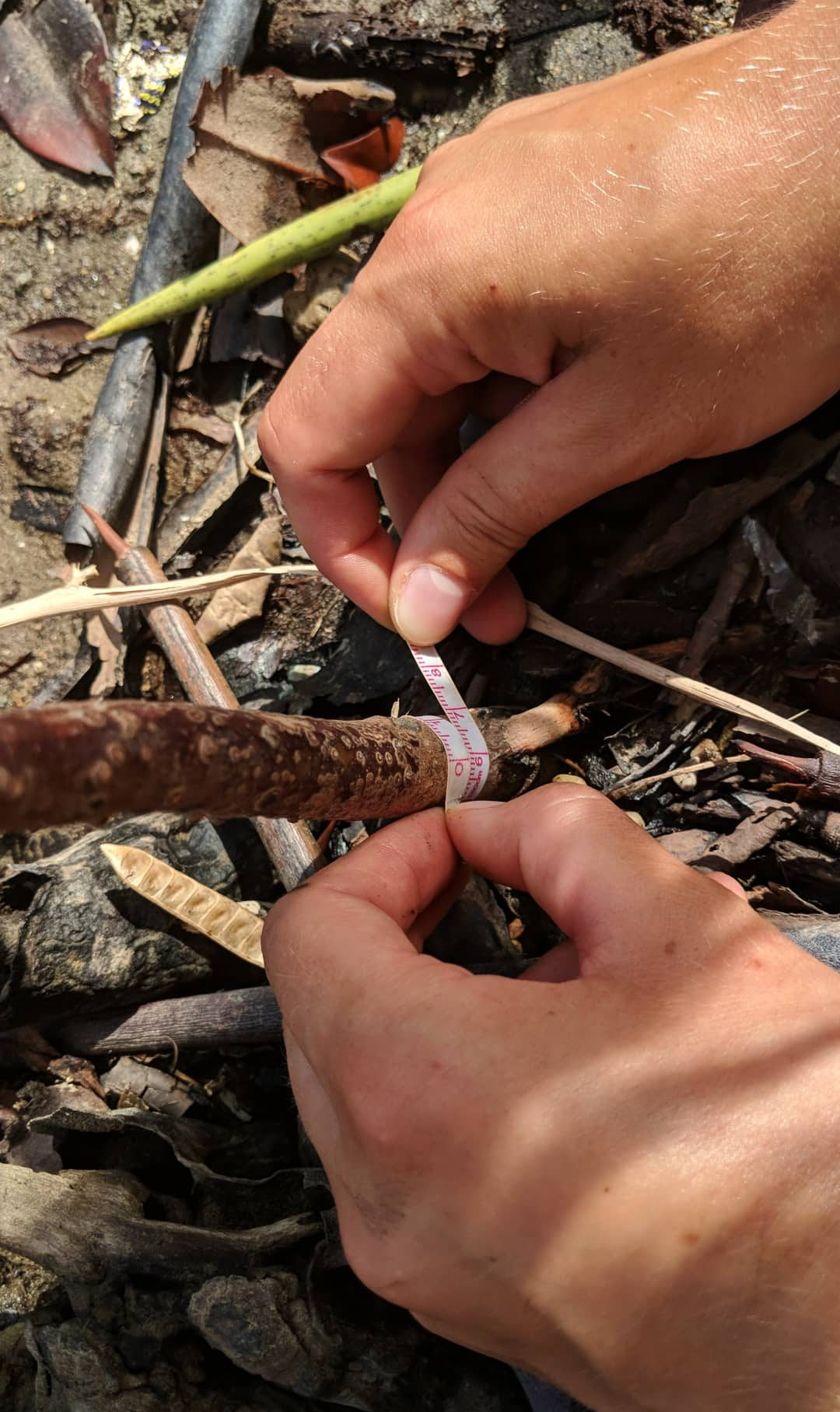 Mangroves form a crucial nursery habitat for many species of fish because their complex root systems keep larger predators from getting in. This means the juveniles are protected as they mature, which allows for increased recruitment back out onto the reef. They also act as a filtration system, keeping sediment and nutrients from the land from washing into the ocean and smothering the organisms growing nearby. Unfortunately, mangroves are used as a source of wood here, so are cut down and burned. In our local mangrove, we can see where mangroves have been burned down before. This is part of the reason mapping the mangroves, not just measuring is important. We want to see which sections are being allowed to grow, and which sections are facing threats to see where planting might be beneficial.