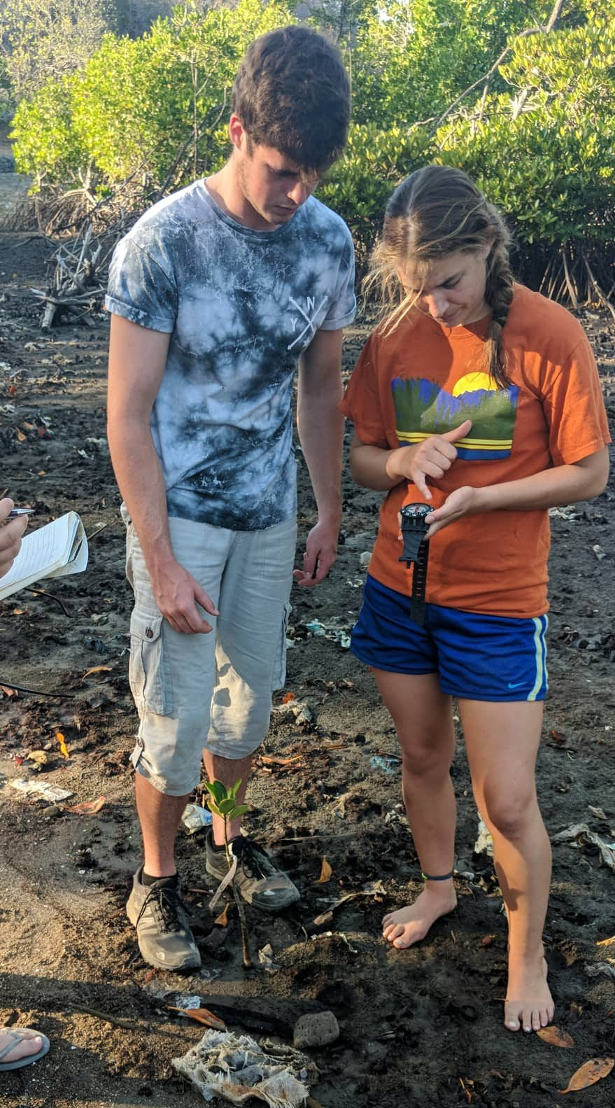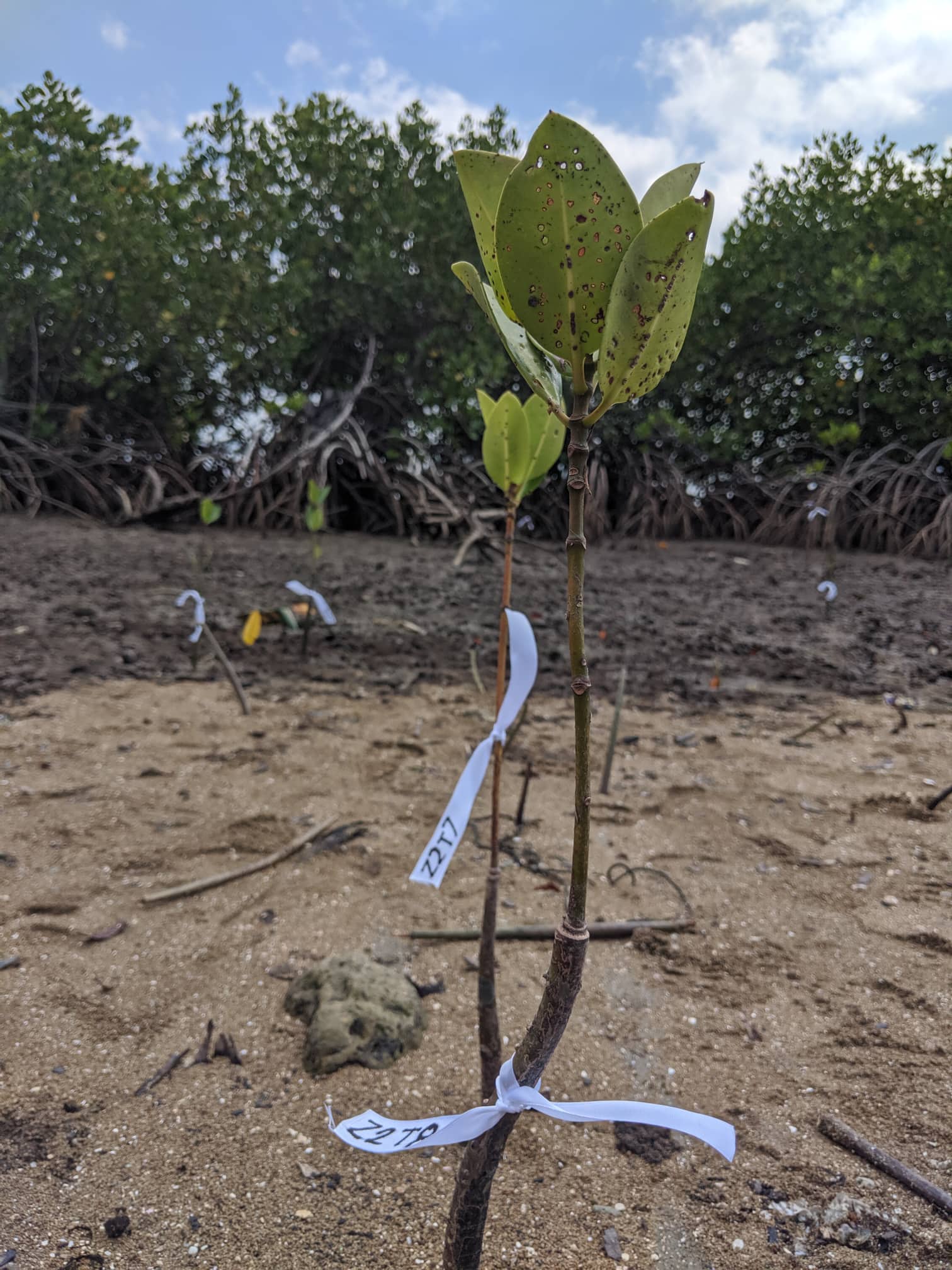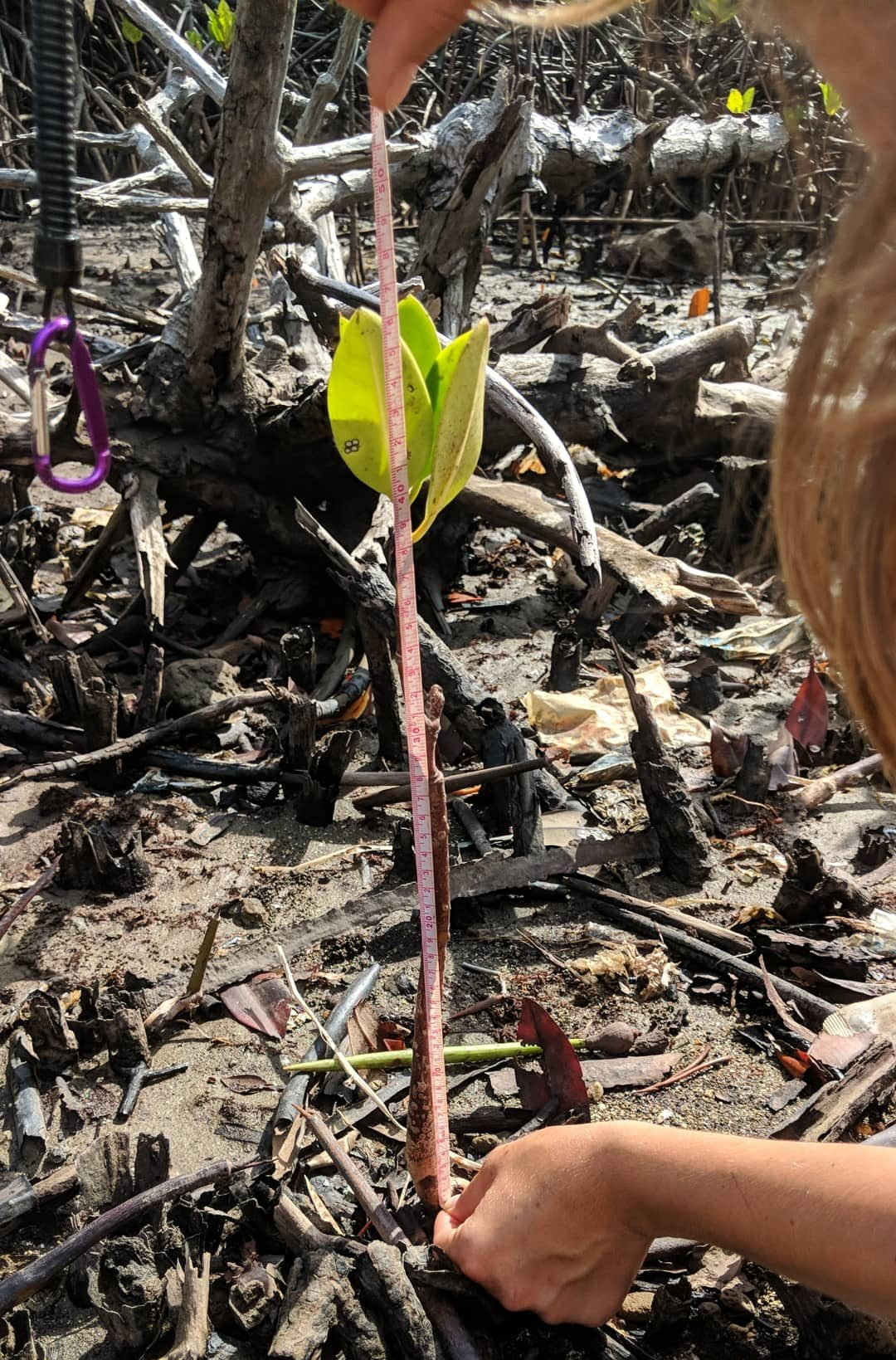 Today we checked in on some of our mangrove seedlings! We have been starting to map and monitor naturally recruiting mangrove seedlings so that we can see where they are successfully growing, and where mangrove planting might be useful. Over the last month or so, volunteers and interns have been spearheading the project with Naoise, our resident school-teacher, and have tagged and taken initial measurements for just over 80 trees. We have measured height of the seedlings, circumference at the base and the number of leaves that each tree has. Today marks the first time we have re-measured to check in on our seedlings, and will help us decide how often we should be re-measuring.